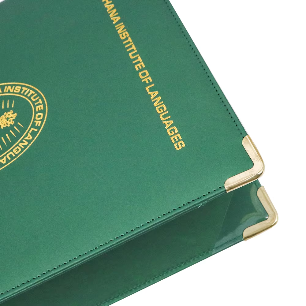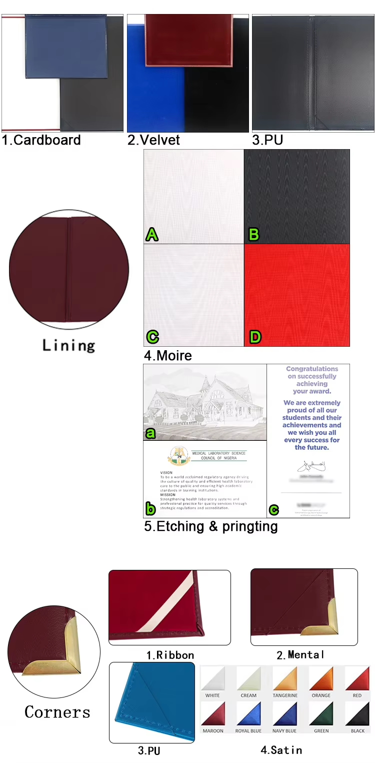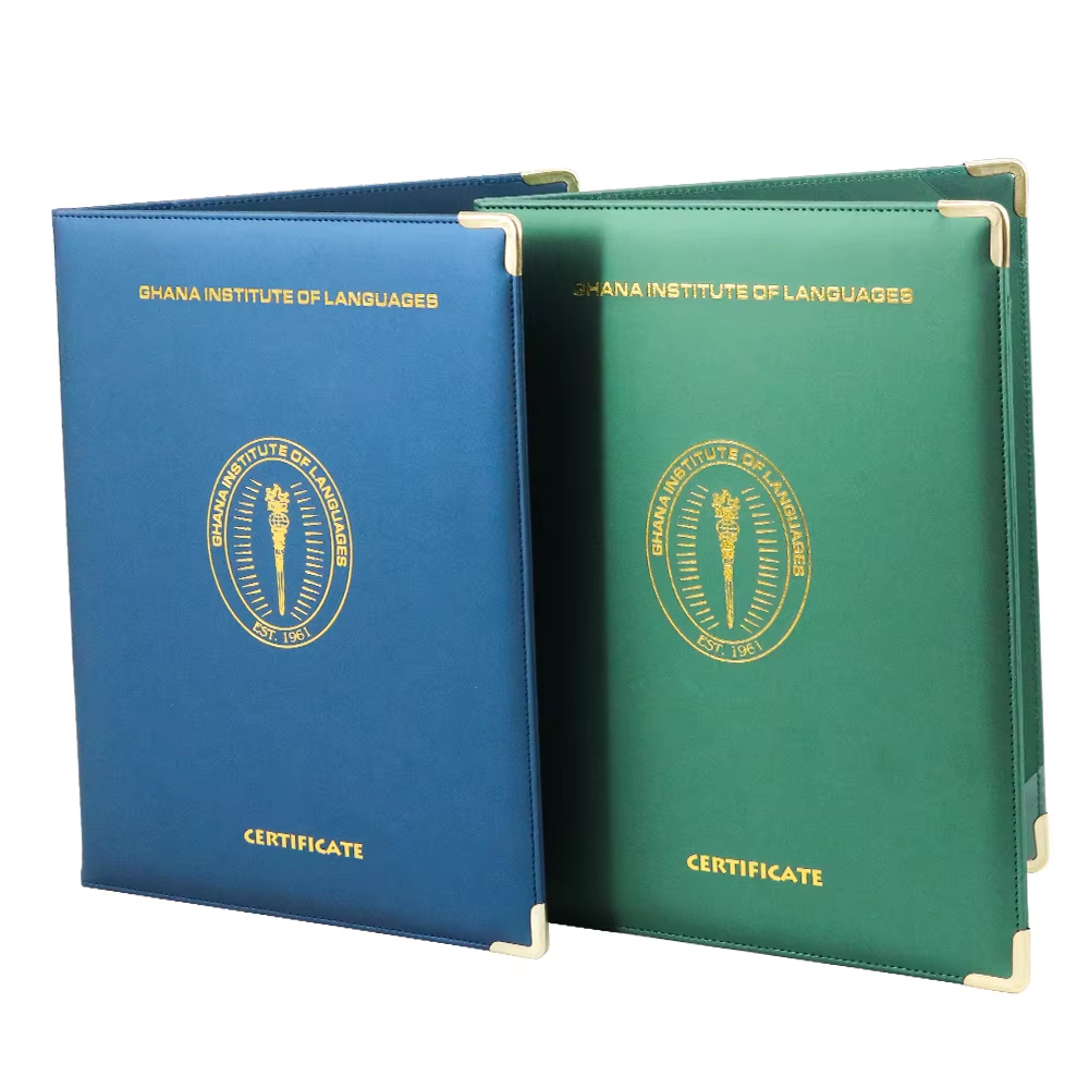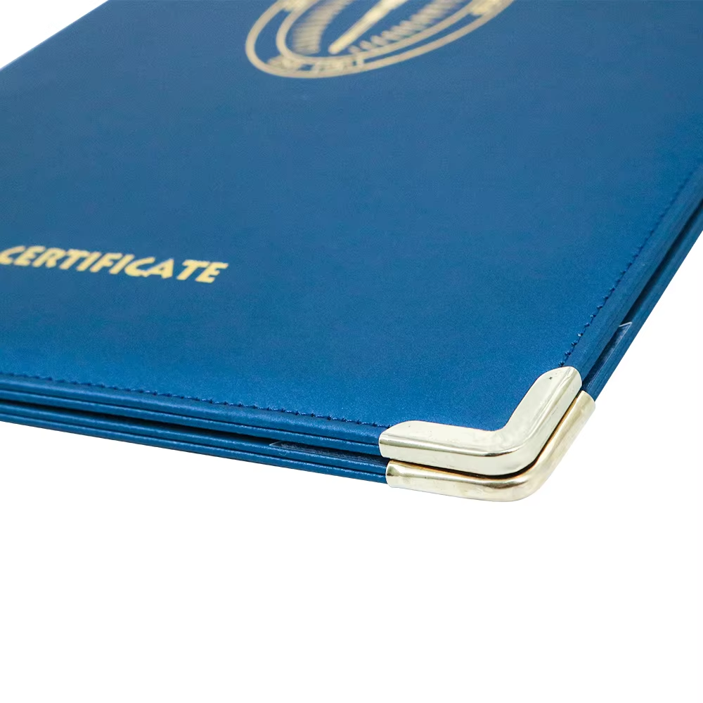 ● Anpassningsalternativ:Vår certifikathållare stöder fullständig anpassning, inklusive tryckta logotyper, präglade mönster och skräddarsydda interna layouter för att passa enstaka eller flera certifikat. Du kan välja mellan ett antal färger, material och finish för att matcha din varumärkesidentitet. Vi tillhandahåller också storleksjusteringar för att säkerställa perfekt kompatibilitet med dina dokumentdimensioner.