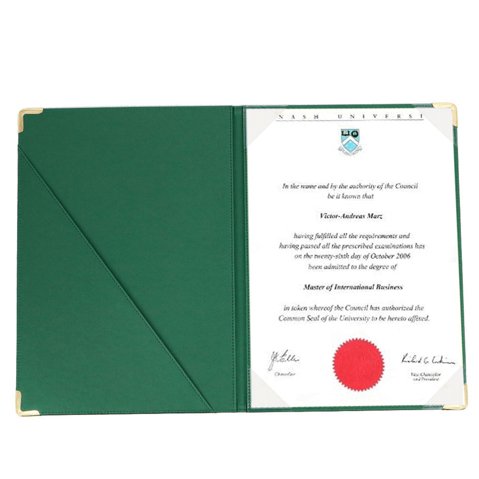 En diplominnehavare är i huvudsak en specialiserad certifikatinnehavare som används i akademiska miljöer. Skolor och universitet använder dem i nästan varje examensceremoni. Till skillnad från grundläggande omslag inkluderar diplominnehavare ofta skollogotypen, examensåret och ibland studentens namn. Premiummaterial som vadderat läder eller läder är vanliga, vilket ger dem ett formellt och varaktigt utseende. Kostnaderna faller vanligtvis mellan $ 20 och $ 40, men deras hållbarhet gör dem till ett långsiktigt alternativ för att visa prestationer.